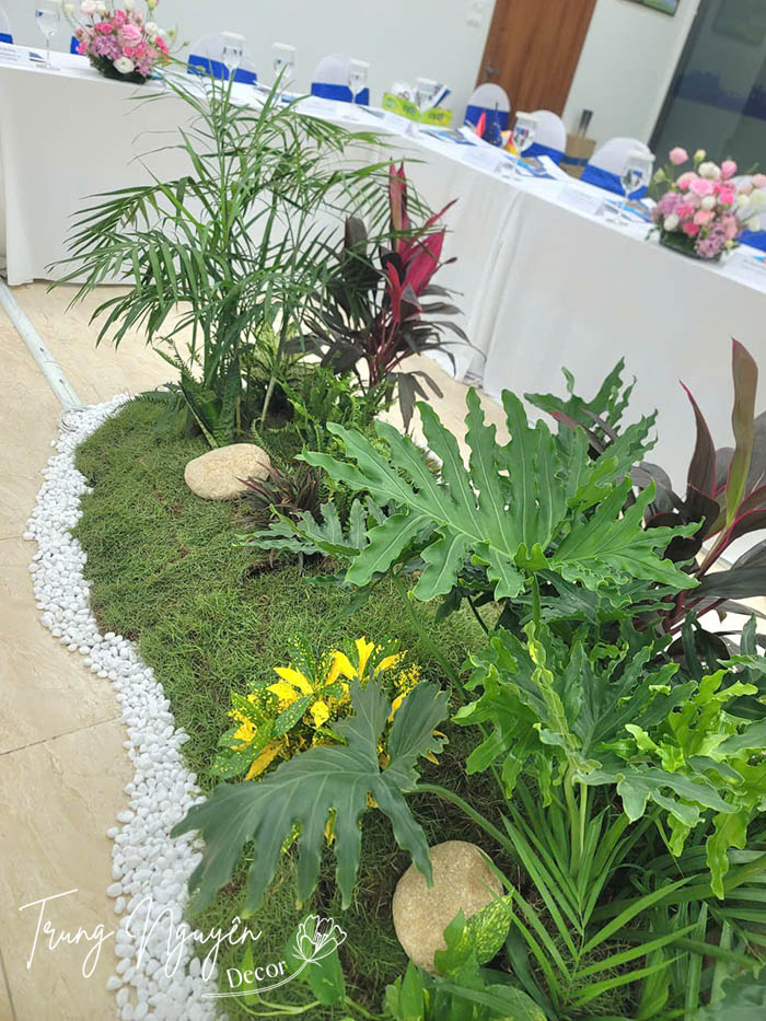 Không gian xanh ấn tượng: cây cảnh giúp sự kiện thêm sang trọng, gần gũi thiên nhiên và tạo ấn tượng tốt với khách mời.