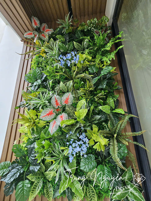 - Tường cây giả hoa: Cây giả hoa mang đến sự đa dạng về màu sắc và hương thơm (giả). Đây là lựa chọn lý tưởng cho những ai yêu thích sắc hoa rực rỡ mà không cần tốn công chăm sóc.